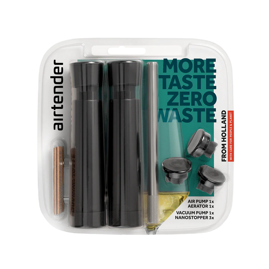Dé complete set voor het genieten van wijn. Schenk wijn per glas en houd geopende flessen tot 5x langer vers onder vacuüm. Belucht wijn tot perfectie met de RVS wijnbeluchter en creëer explosieve smaak. (1x Airtender vacuümpomp, 1x Airtender luchtpomp, 1x Precision Aerator & 3x Nanostopper).
