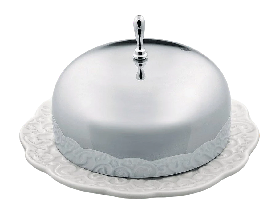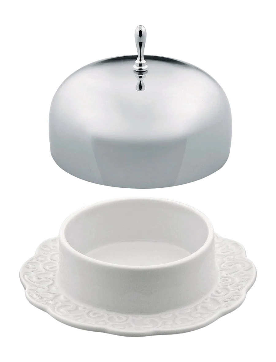 De Alessi Dressed botervloot is een verfijnd tafelaccessoire ontworpen door Marcel Wanders. Deze elegante botervloot combineert functionaliteit met subtiele versiering, precies zoals je van de Dressed-serie van Alessi mag verwachten. Gemaakt van hoogwaardig porselein met een spiegelgepolijste roestvrijstalen deksel, past dit ontwerp perfect op elke ontbijttafel. De combinatie van materiaal en vorm zorgt ervoor dat de boter vers blijft en stijlvol gepresenteerd wordt.