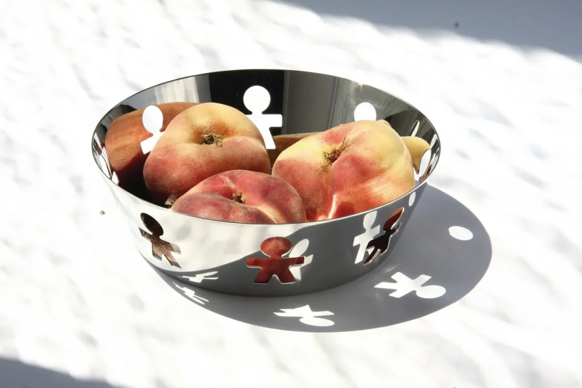 De Alessi Girotondo fruitschaal is een prachtig voorbeeld van iconisch design. Het speelse, opengewerkte patroon van figuurtjes rondom de rand geeft deze schaal een unieke en vrolijke uitstraling die perfect past in elke keuken of eetkamer.